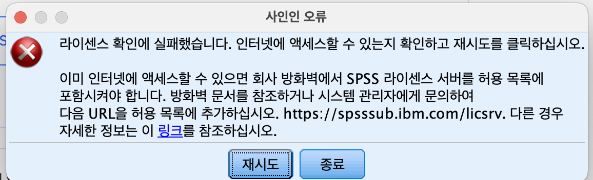 이미 인터넷에 액세스할 수 있는 경우, 회사 방화벽에서 라이선스 서버를 허용 목록에 올려야 합니다. 다음 URL(https://spsssub.ibm.com/licsrv)을 허용 목록에 추가해 주세요.
